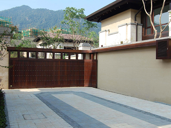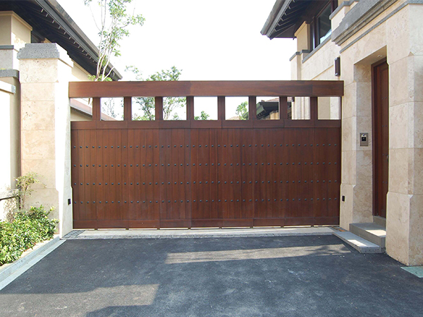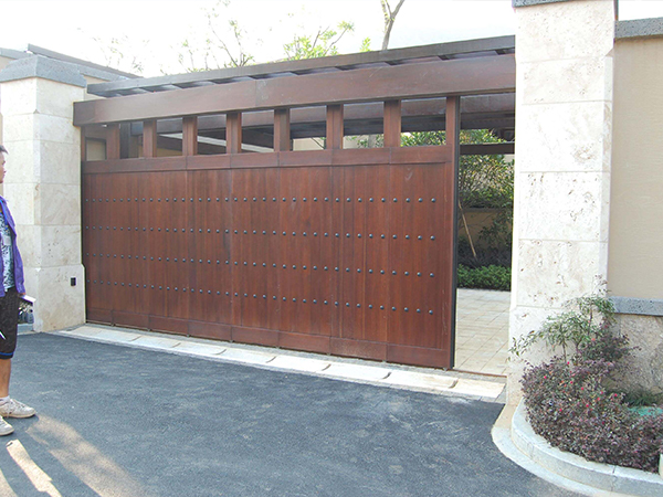 庭院侧滑门,侧向转弯开启,常用绿柄桑、菠萝格木材制作,内有钢骨架保证大门强度。多用于高端别墅无顶梁的院墙大门(门洞侧面空间不够时)。