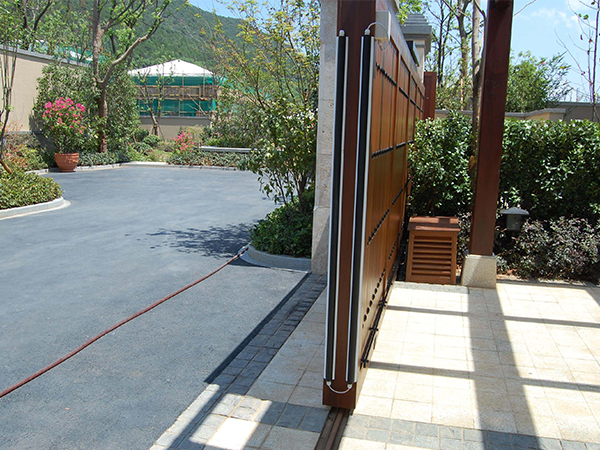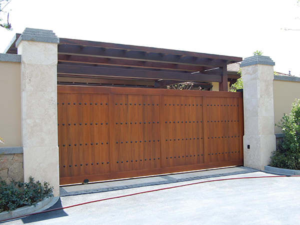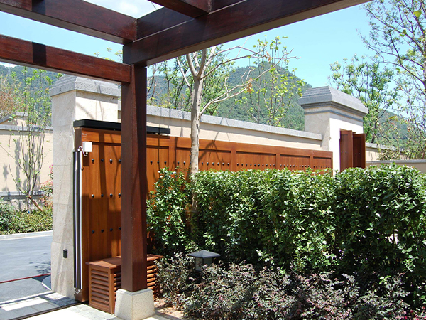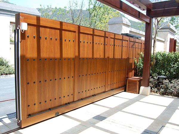 庭院直线门,侧向直线开启,常用绿柄桑、菠萝格木材制作,内有钢骨架保证大门强度。多用于高端别墅无顶梁的院墙大门。