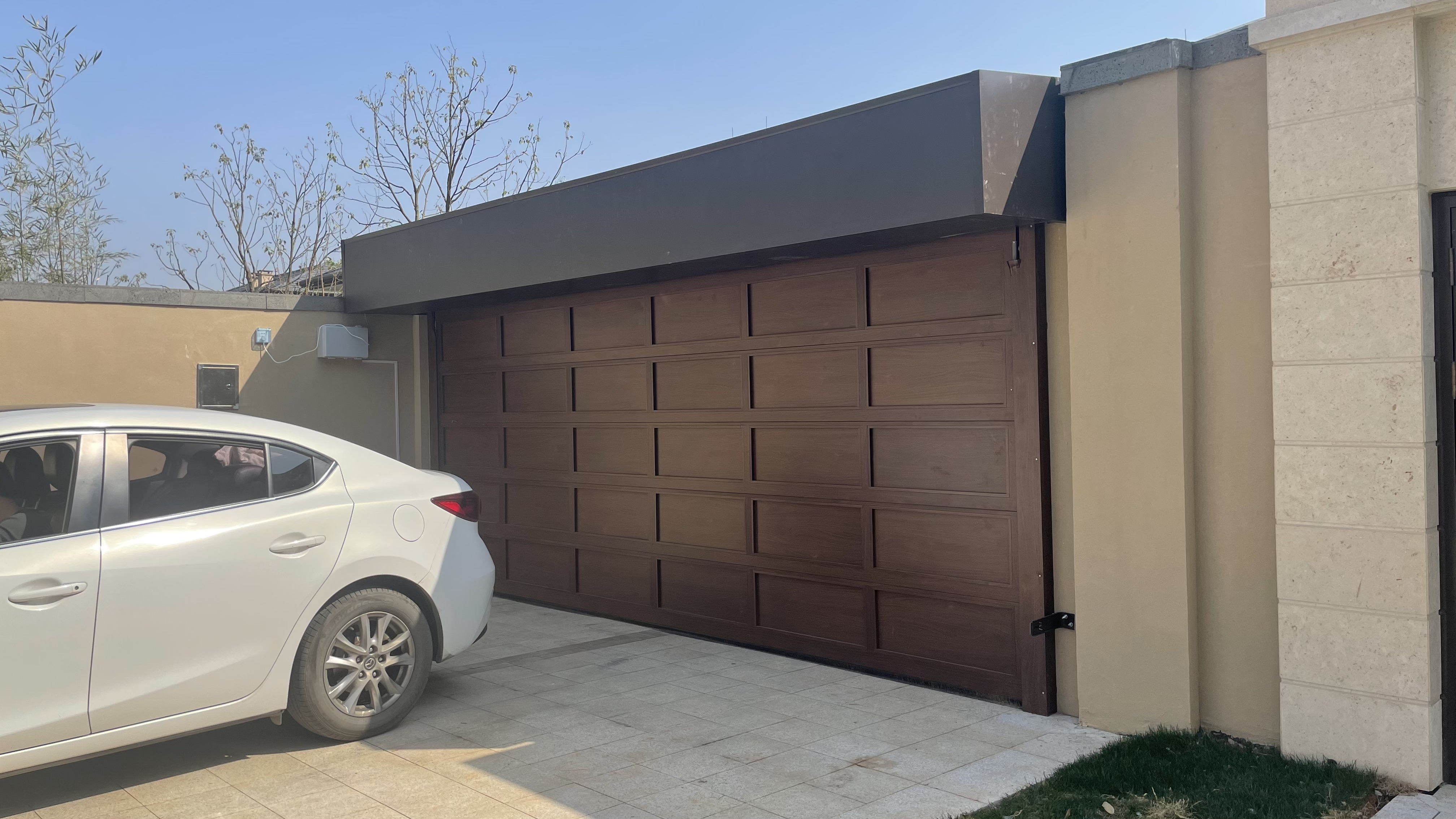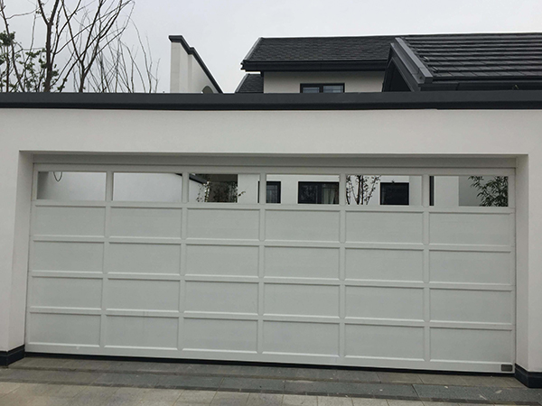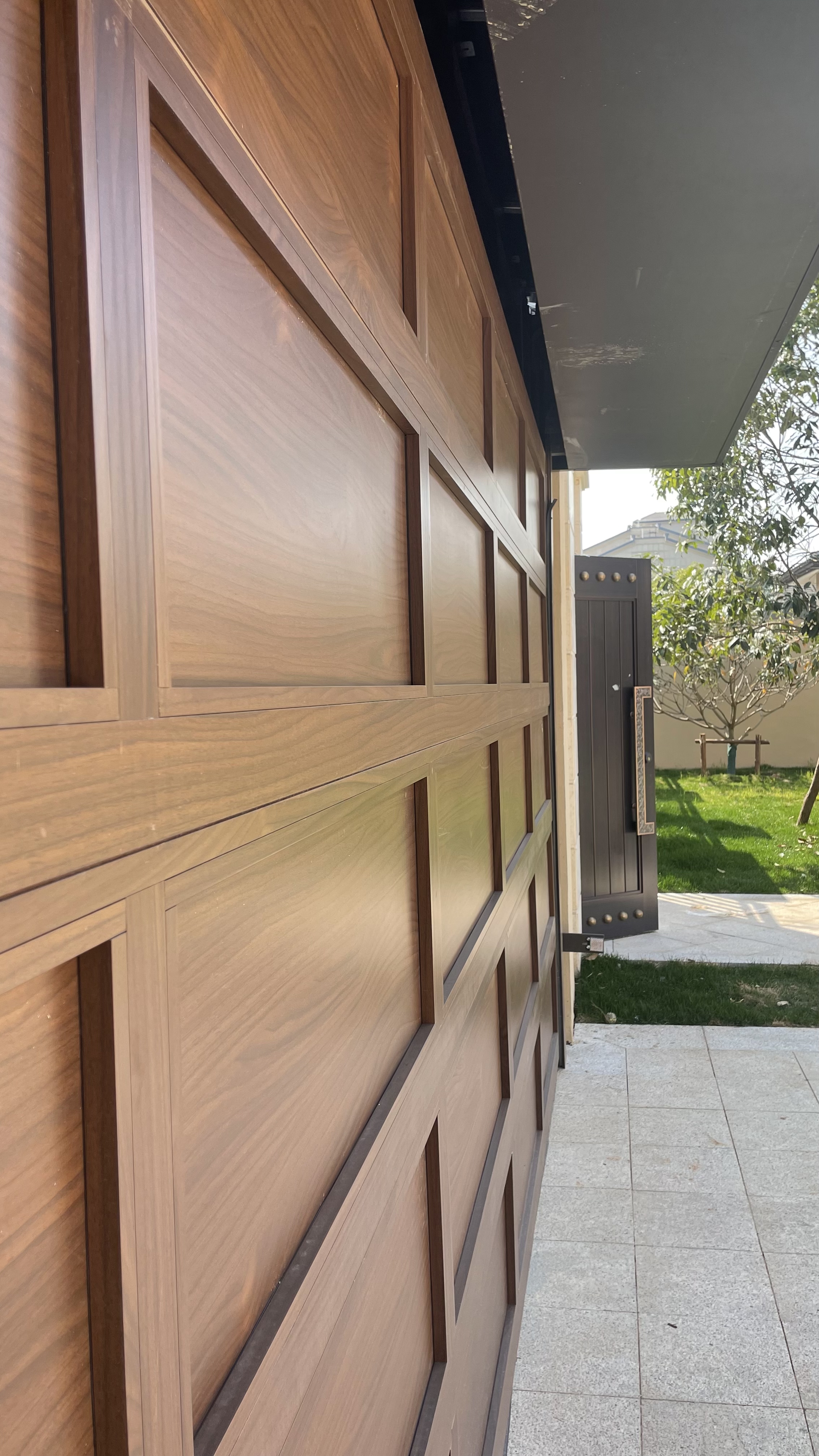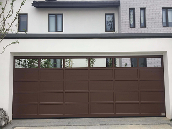 车库门门板采用铝合金型材制作,表面做喷塑处理。铝合金车库门的优点是不会开裂,后期维护保养方便。多用与中高端别墅室内车库大门。